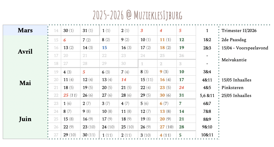 En van het lentesemester. Houd er rekening mee dat in het trimester van april tot en met juni 2026 de "11e" les in het midden van de periode kan vallen, om beter aan te sluiten bij de landelijke vrije dagen: