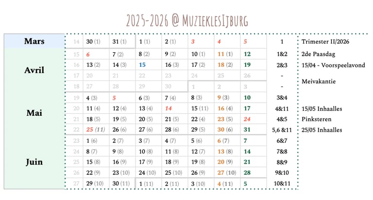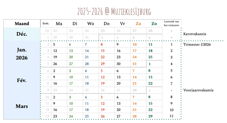 Hieronder vindt u de exacte lesdatums van het wintertrimester:
