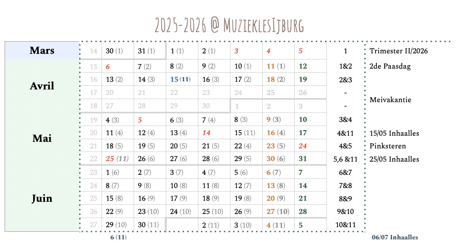 Please be advised that in April to June trimester 2026 the "11th" lesson could be in the middle of the period, to better accomodate the national non-working days.