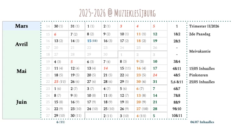 En van het lentesemester. Houd er rekening mee dat in het trimester van april tot en met juni 2026 de "11e" les in het midden van de periode kan vallen, om beter aan te sluiten bij de landelijke vrije dagen: